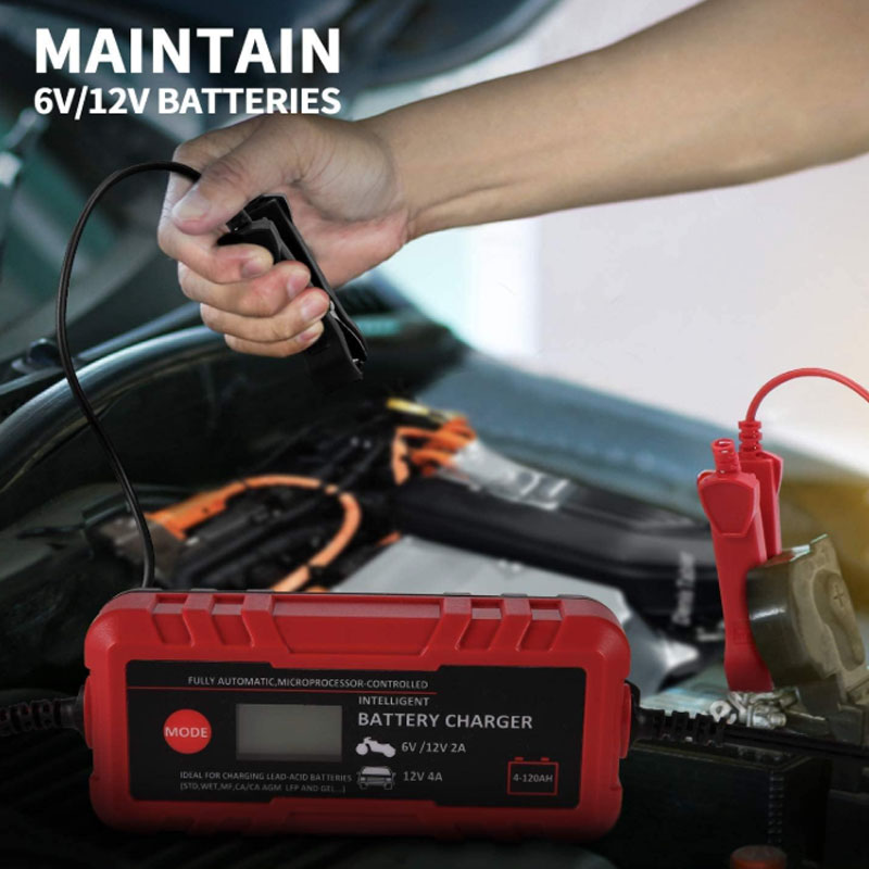 شاحن بطارية متعدد الأغراض: هذا الشاحن متوافق مع بطاريات 6 فولت و12 فولت، مما يجعله مثاليًا لمجموعة واسعة من المركبات والمعدات، بما في ذلك جزازات العشب والقوارب والسيارات والدراجات النارية ومركبات ATV والدراجات البخارية وعربات الثلوج والمركبات الكهربائية والأدوات الكهربائية. إنه مثالي لصيانة وشحن أنواع مختلفة من بطاريات الرصاص الحمضية.