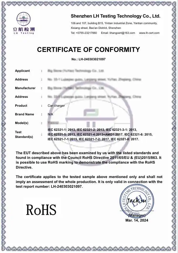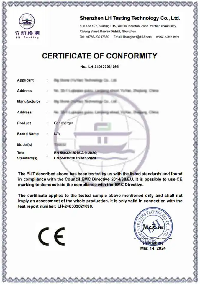 ج: باعتبارنا مصنعًا محترفًا، فإن منتجاتنا متوافقة تمامًا مع معايير السلامة والبيئة الدولية. نحن نقدم منتجات معتمدة من CE وRoHS. علاوة على ذلك، فإن منشأة الإنتاج لدينا حاصلة على شهادة BSCI وISO، مما يضمن أن محولات شاحن السيارة لدينا تلبي المعايير الفنية والأخلاقية الصارمة التي تتطلبها العلامات التجارية العالمية المتميزة.
