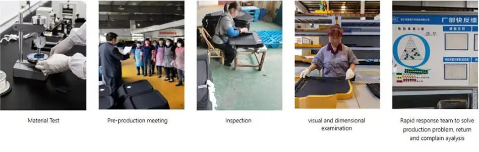 نحن متوافقون تمامًا مع ISO9001 لتصميم وتصنيع سجادات السيارات، وISO/TSI16949 لمراقبة الجودة، وISO14001:2015 للإدارة البيئية، وBSCI للمسؤولية الاجتماعية، ومعايير EU REACH للمواد الخام. لدينا مرافق اختبار داخلية لإجراء فحوصات ذاتية لضمان اجتياز منتجاتنا للاختبارات التي تجريها SGS أو Intertek أو أي مفتش آخر قد يطلبه العملاء.