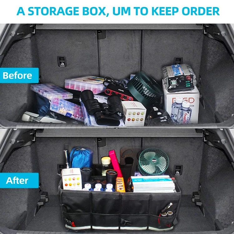 ثلاث مساحات رئيسية لتنظيم الأدوات والطعام والمعدات الرياضية والمنظفات وأدوات الطوارئ. أربعة جيوب جانبية شبكية تحمل أشياء صغيرة مثل المناشف أو البطاقات. جيب بغطاء أمامي يؤمن الاحتمالات والنهايات. يناسب الشاحنات وسيارات السيدان وسيارات الدفع الرباعي والشاحنات الصغيرة وأي مركبة تقريبًا.