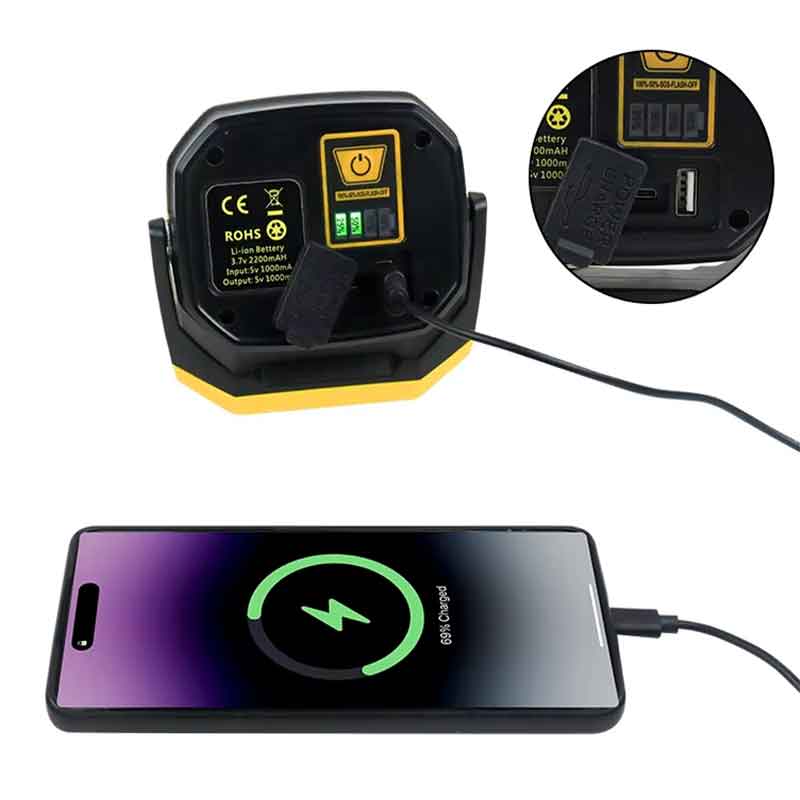 ج: نعم. يدعم منفذ USB-C كلاً من الإدخال (شحن مصباح العمل) والإخراج (يعمل كبنك طاقة لشحن الأجهزة المحمولة).