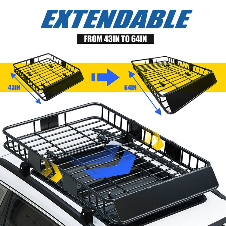تصميم قابل للتمديد: تتميز سلة حامل حامل السقف هذه بتصميم ذكي قابل للتمديد - حجم قياسي (43 بوصة × 39 بوصة × 6 بوصات) للسيارات الصغيرة وقابلة للتوسيع حتى 64 بوصة للمركبات الأكبر حجمًا، مما يزيد من مساحة الشحن. شكله القابل للطي يجعل من السهل تفكيكه ونقله وتخزينه عند عدم استخدامه. إنها مناسبة لاحتياجات السفر والتخزين المرنة.